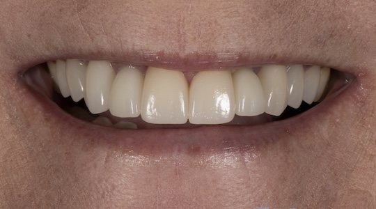Six implants were placed and the old crowns were replaced. The result is very natural looking and the patient now has the confidence to eat, laugh, and smile.