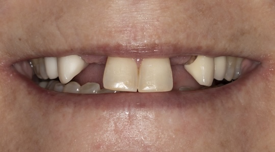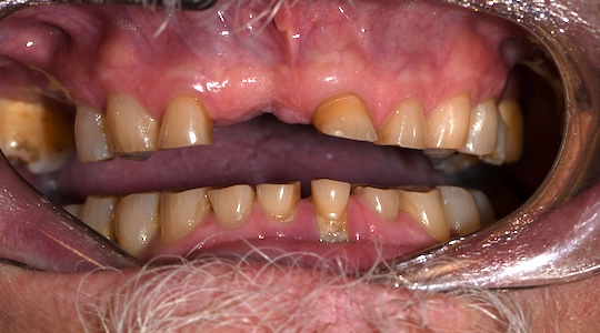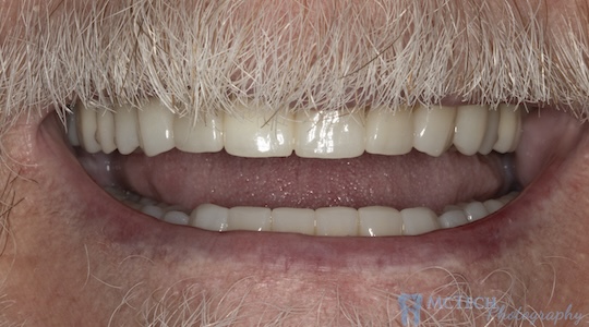 This patient lost several teeth in an auto accident. In the top photo, he is wearing a removable partial denture, which did not match his other teeth, which were had porcelain crowns.